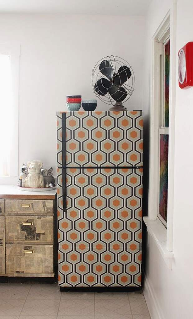 Декорируйте старый холодильник легко удаляемыми обоями.