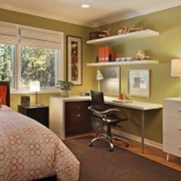 Просто замечательно, если удастся в квартире одну из комнат выделить под рабочий кабинет, особенно если в этом есть острая необходимость. Однако если таковой возможности нет и все комнаты задействованы для других целей, то вполне реально обустроить полноценную рабочую зону в спальне. Для этого идеально подойдет один из углов комнаты. Для того чтобы посидеть за компьютером или просмотреть важные документы много места не понадобиться, поэтому здесь достаточно будет установить небольшой угловой стол с ящиками и навесить над ним несколько полок, на которых можно поместить нужную технику и различные мелочи. Все что необходимо, это подобрать идеальное сочетание всех элементов мебели, которая будет в спальне, чтобы все они составляли гармоничную картину. Только так удастся правильно вписать рабочее место в спальне, чтобы оно не казалось лишним в интерьере.