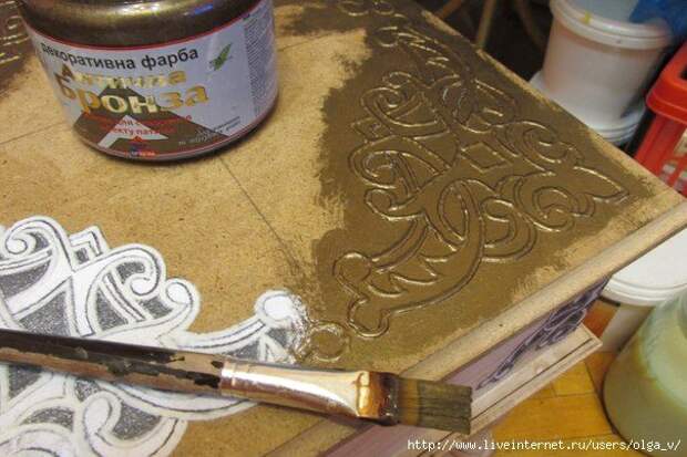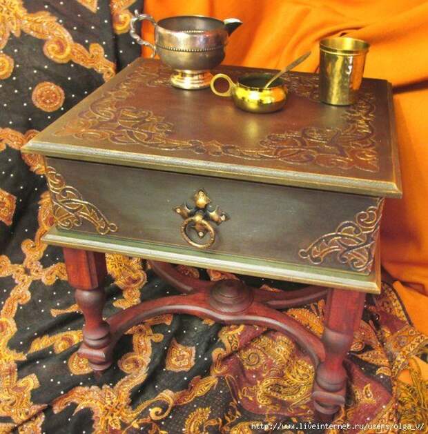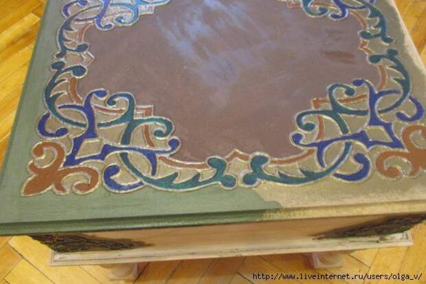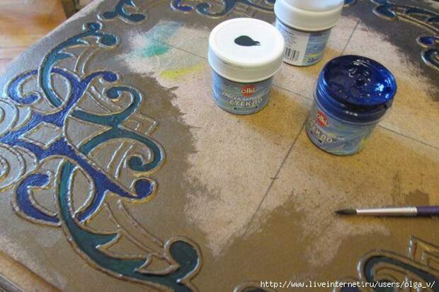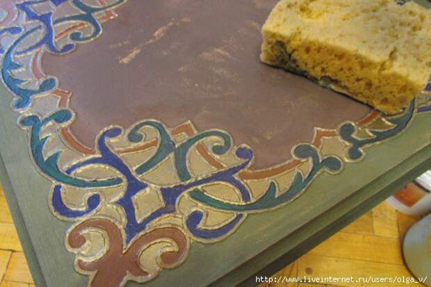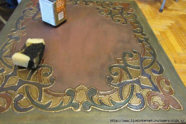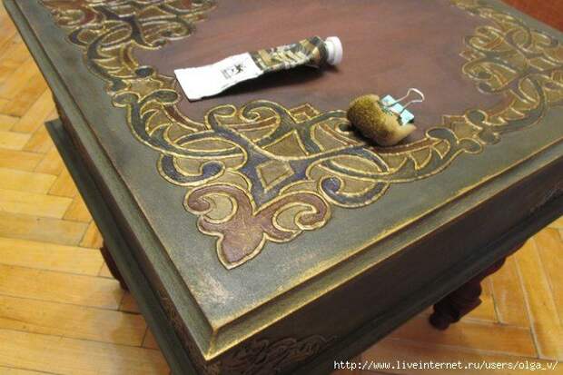 Затем с помощь реставрационной пасты «старое золото» оттеняем объемный рисунок и грани самого столика.