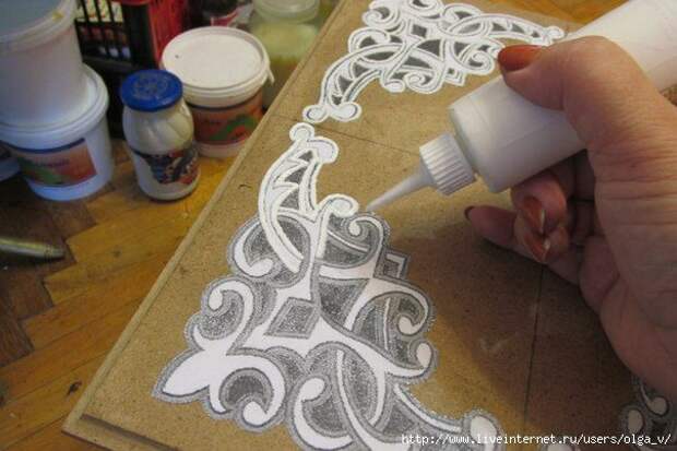 Затем по контурам рисунка из тюбика выдавливаем объемную пасту. можно купить в худ.магазине структурную краску или пасту.