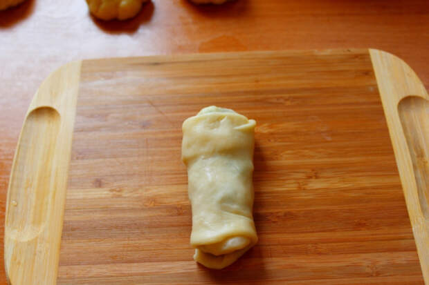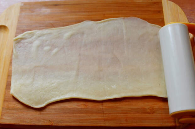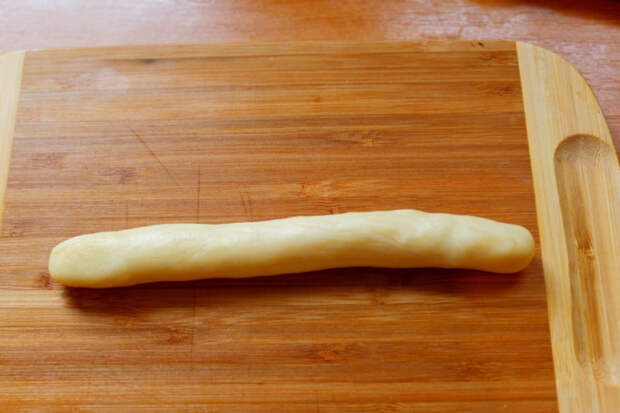 Очень удобно раскатывать тесто на прямоугольной доске. Для начала скатать кусочек теста в длинную колбаску.