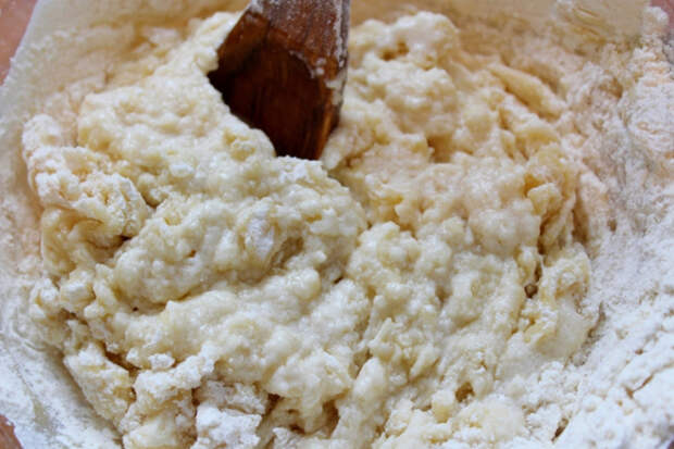 Добавить частями муку. Сначала перемешивать тесто ложкой, потом замесить руками. Долго месить не нужно - тесто должно получиться эластичным и мягким.