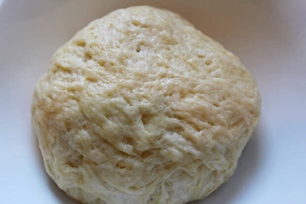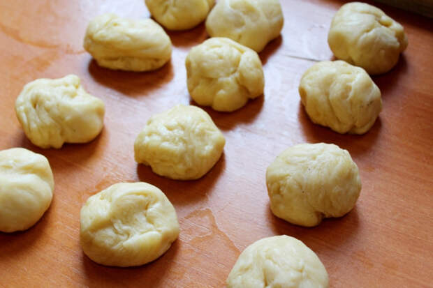 Разделить тесто на кусочки (муку больше не использовать, тесто вполне эластичное и хорошо раскатывается). Я разделила на 12 кусочков по 45 г каждый.